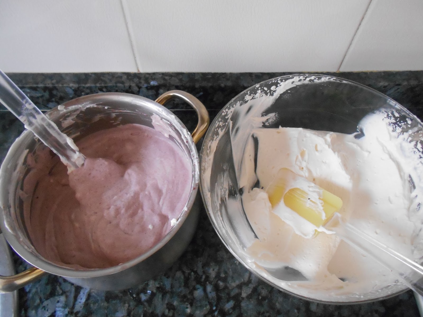 Mezclamos unas 3/4 partes de la nata montada con el sirope de frutos del bosque, con movimientos envolventes.