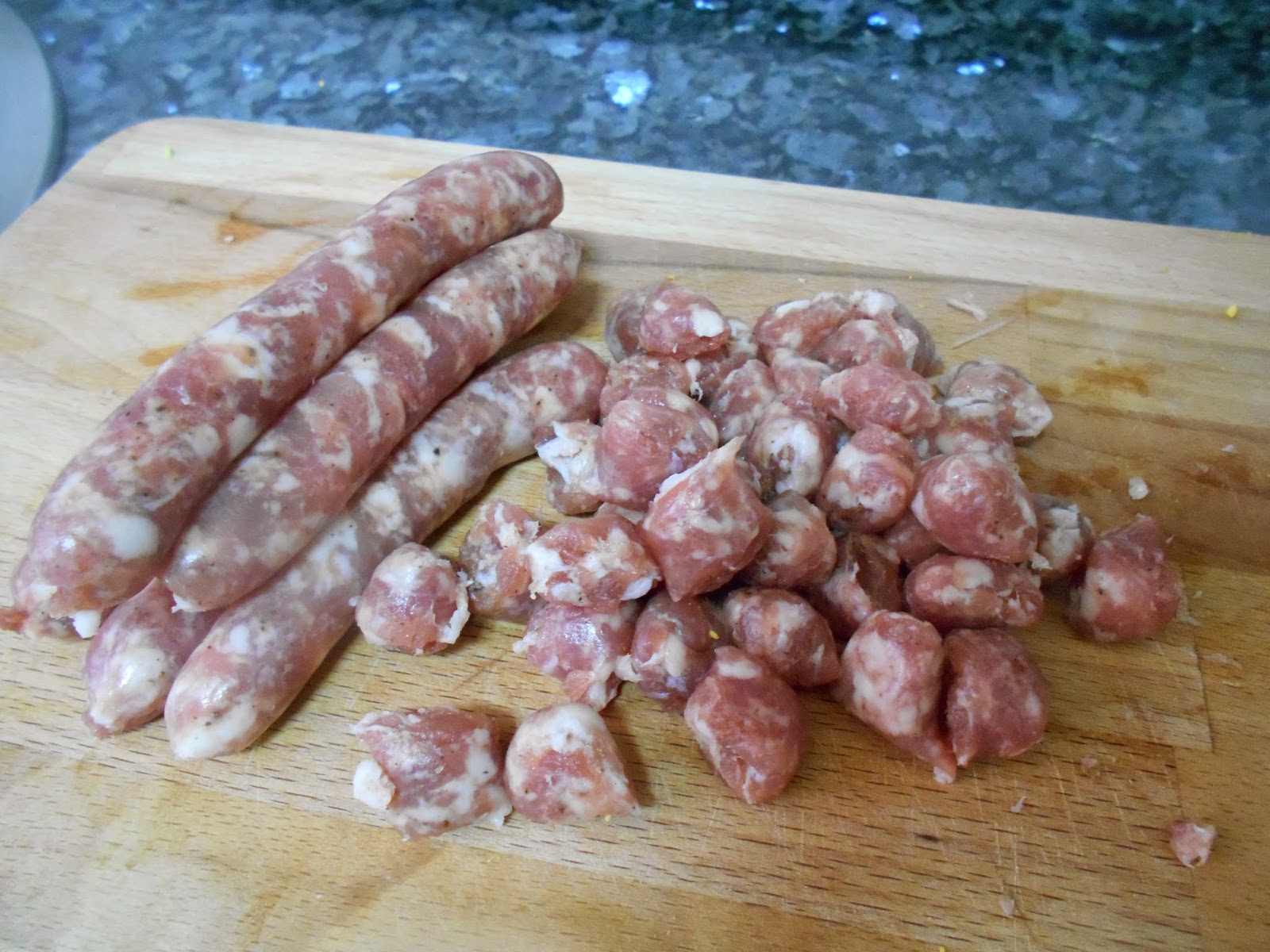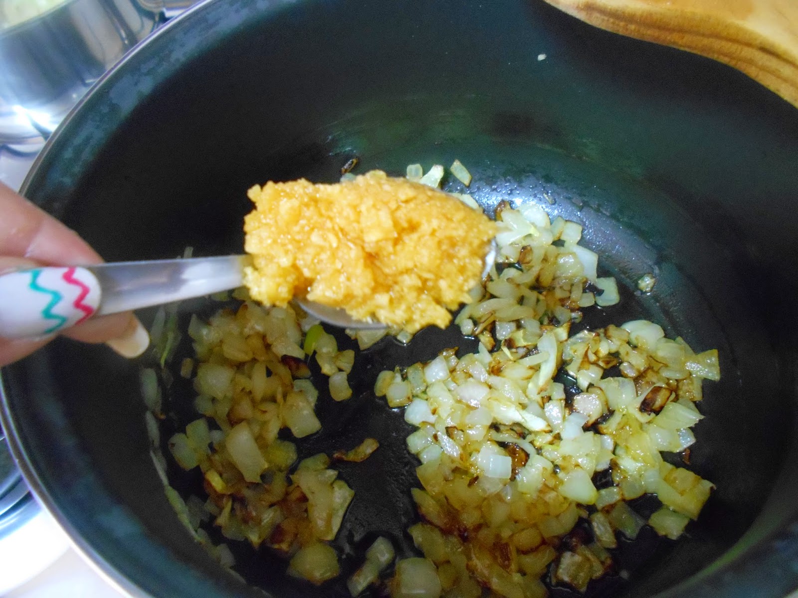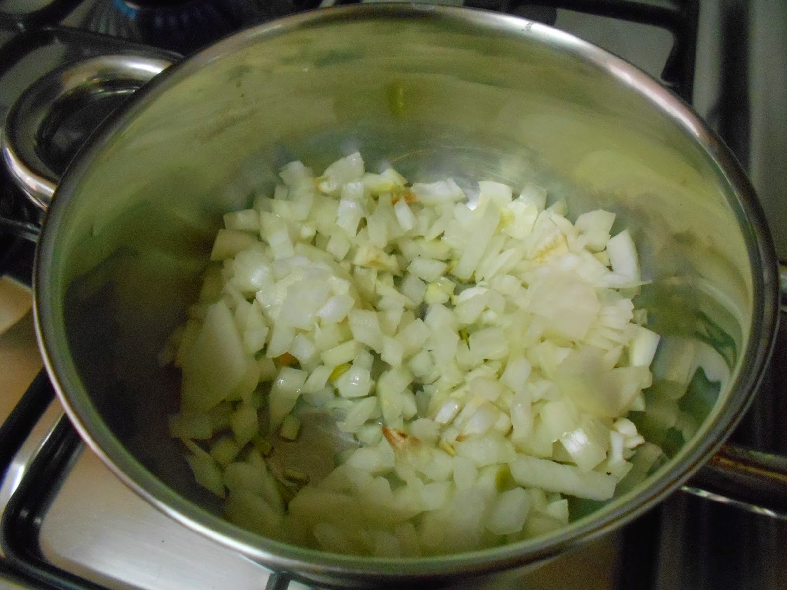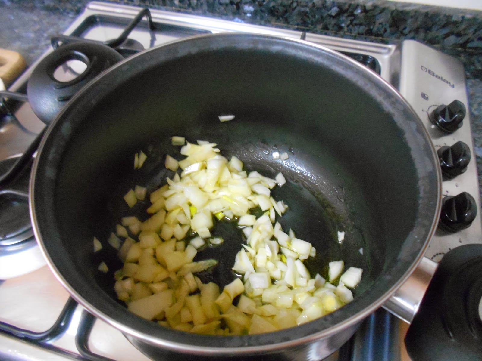 Cortamos las salchichas muy pequeñito y lo echamos a la olla. Sofreimos bien