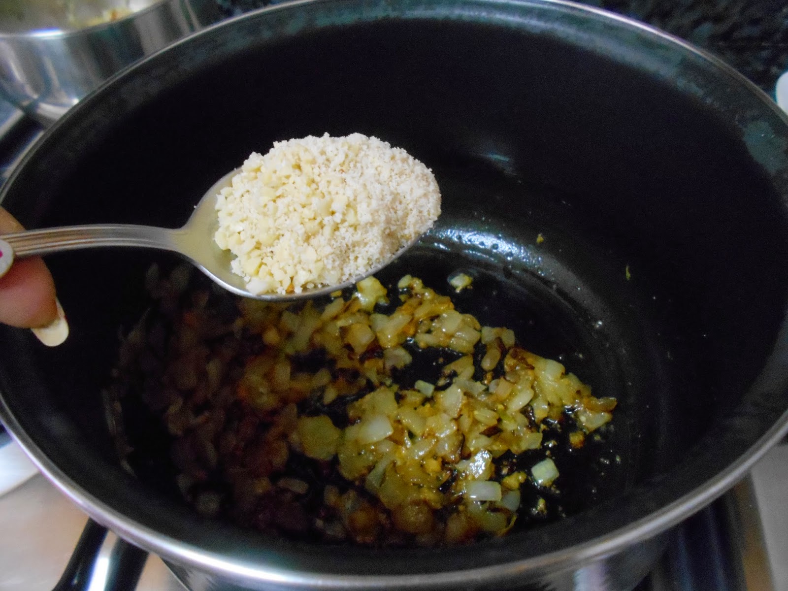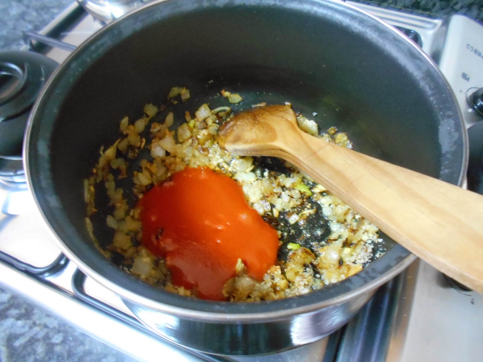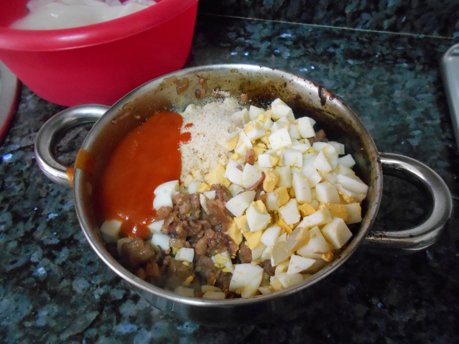 Apartamos la olla del fuego echamos el pan rallado, el tomate frito y los huevos picados.